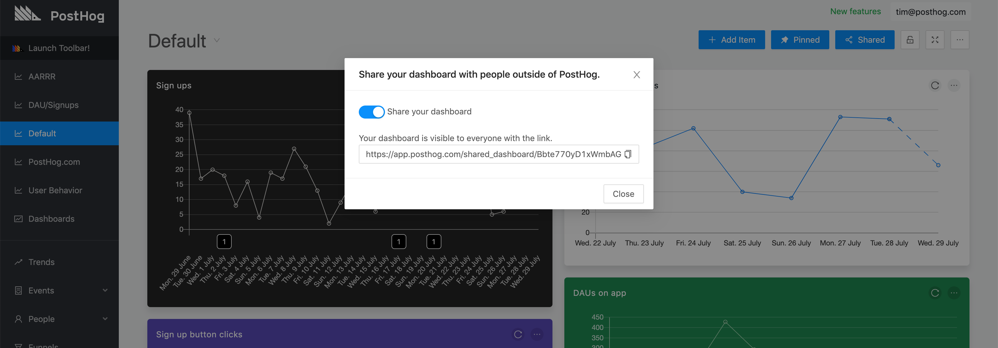 Dashboard on a TV in your office? Want to have a public stats page? Share a dashboard with someone who doesn't have a PostHog account? You can now publicly share a dashboard. Just click "Share Dashboard" and enable sharing. You'll get a link that's publicly accessible.