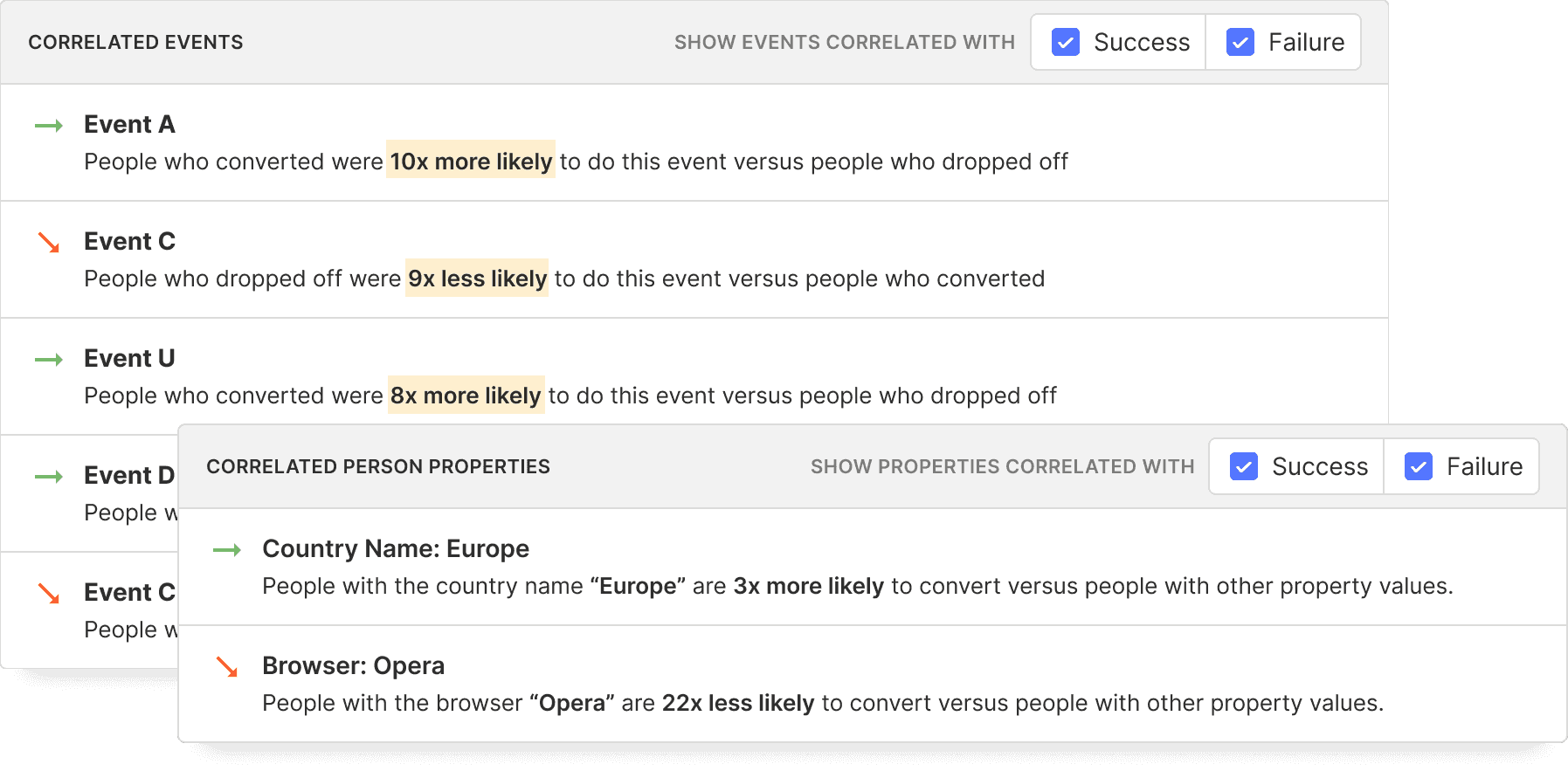 Instantly see what events and user properties correlate to success or failure in any PostHog funnel!