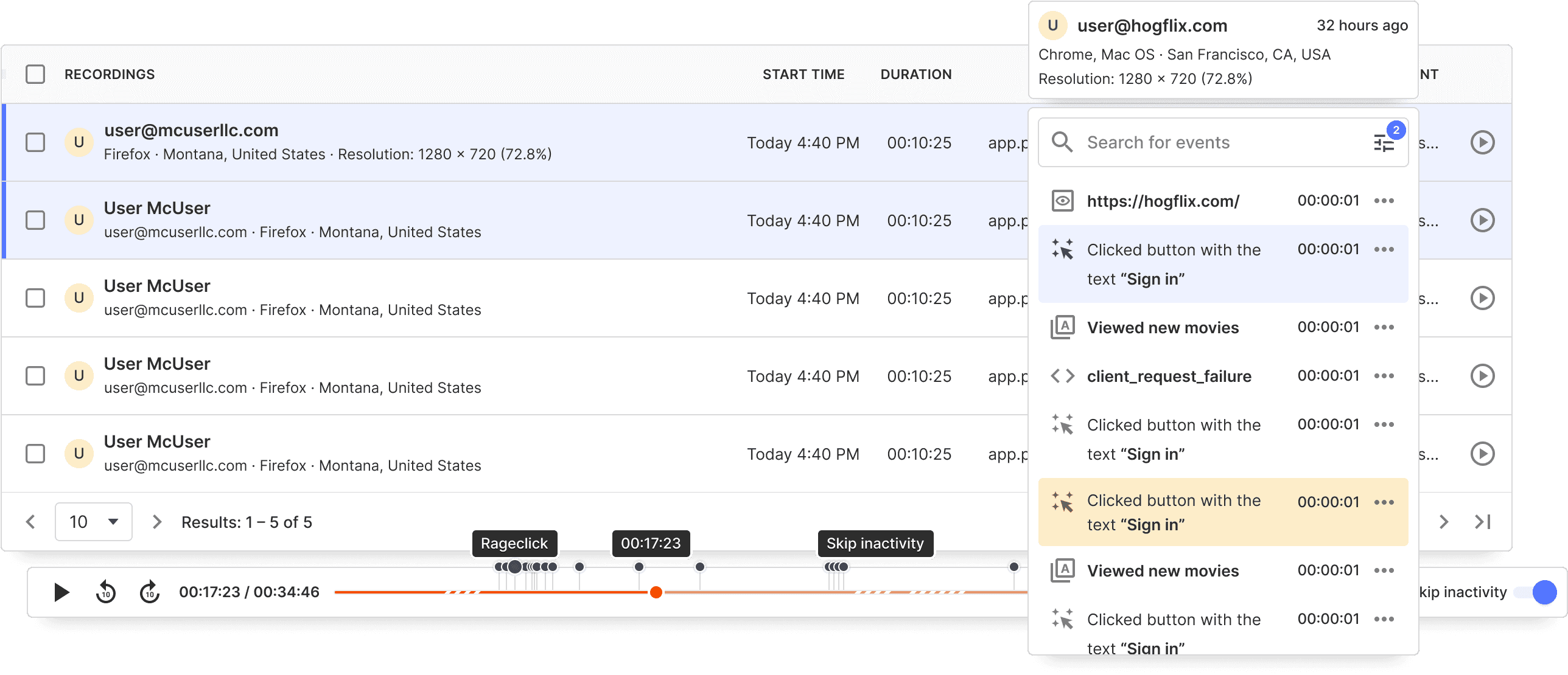 View recordings for users who completed a specific action or event. Watch how specific features are being used, or how bugs came about.